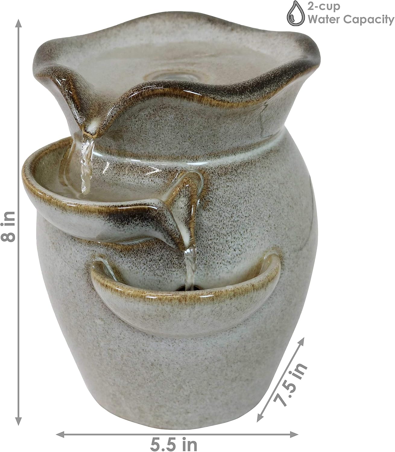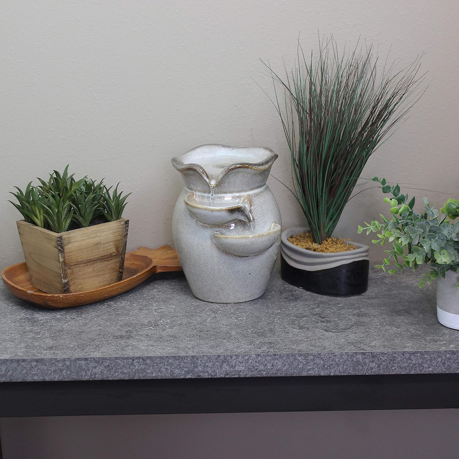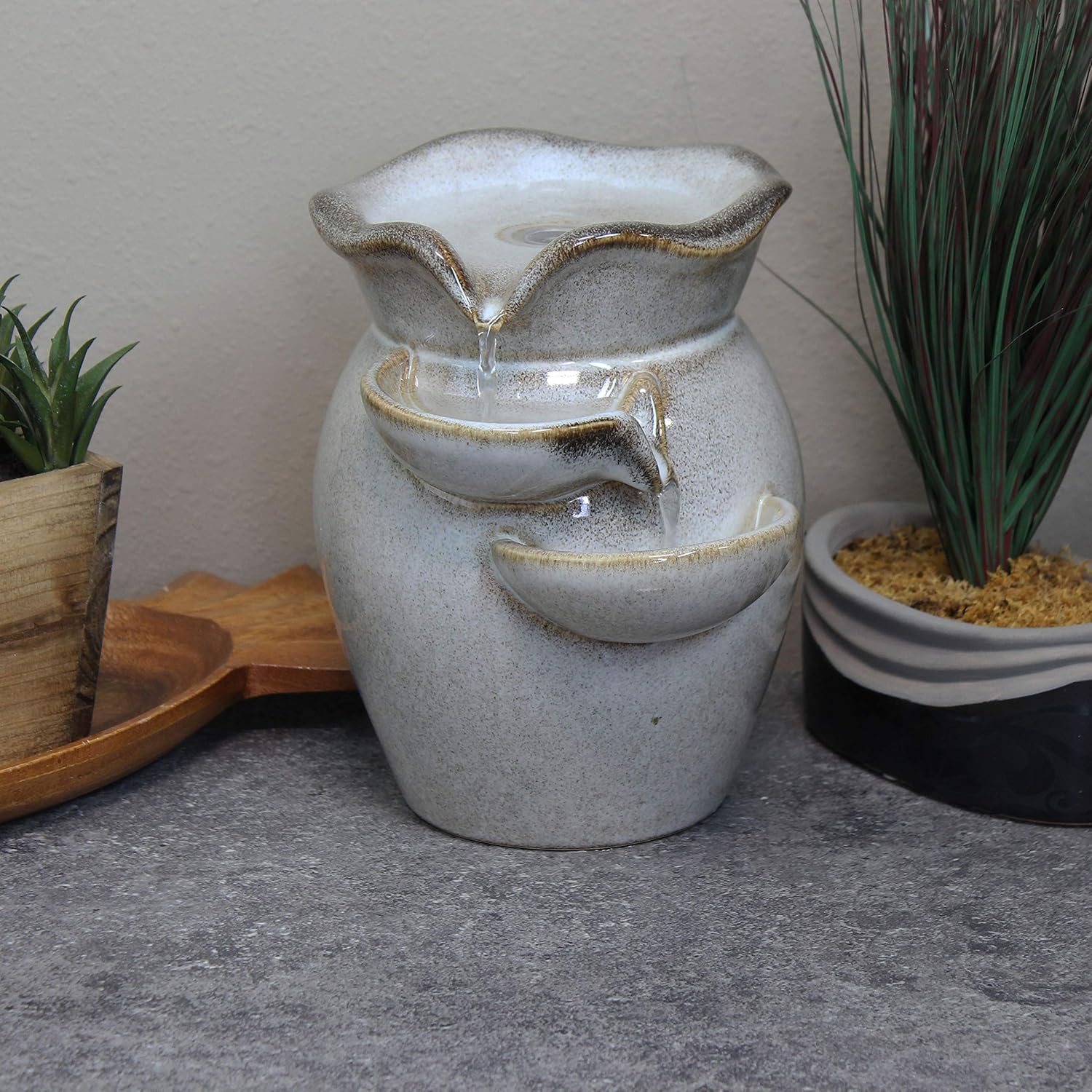 Make any home or office more tranquil and serene with the Cascading Side Tiers Ceramic Tabletop Water Fountain. Water flows gently from the top tier into the side tiers below, creating a calming ambiance. Perfect for decorating a desk, kitchen counter, or tabletop. Includes 1 tabletop fountain and 1 electric submersible pump for easy setup. No plumbing is required, as the pump recirculates water continuously.
