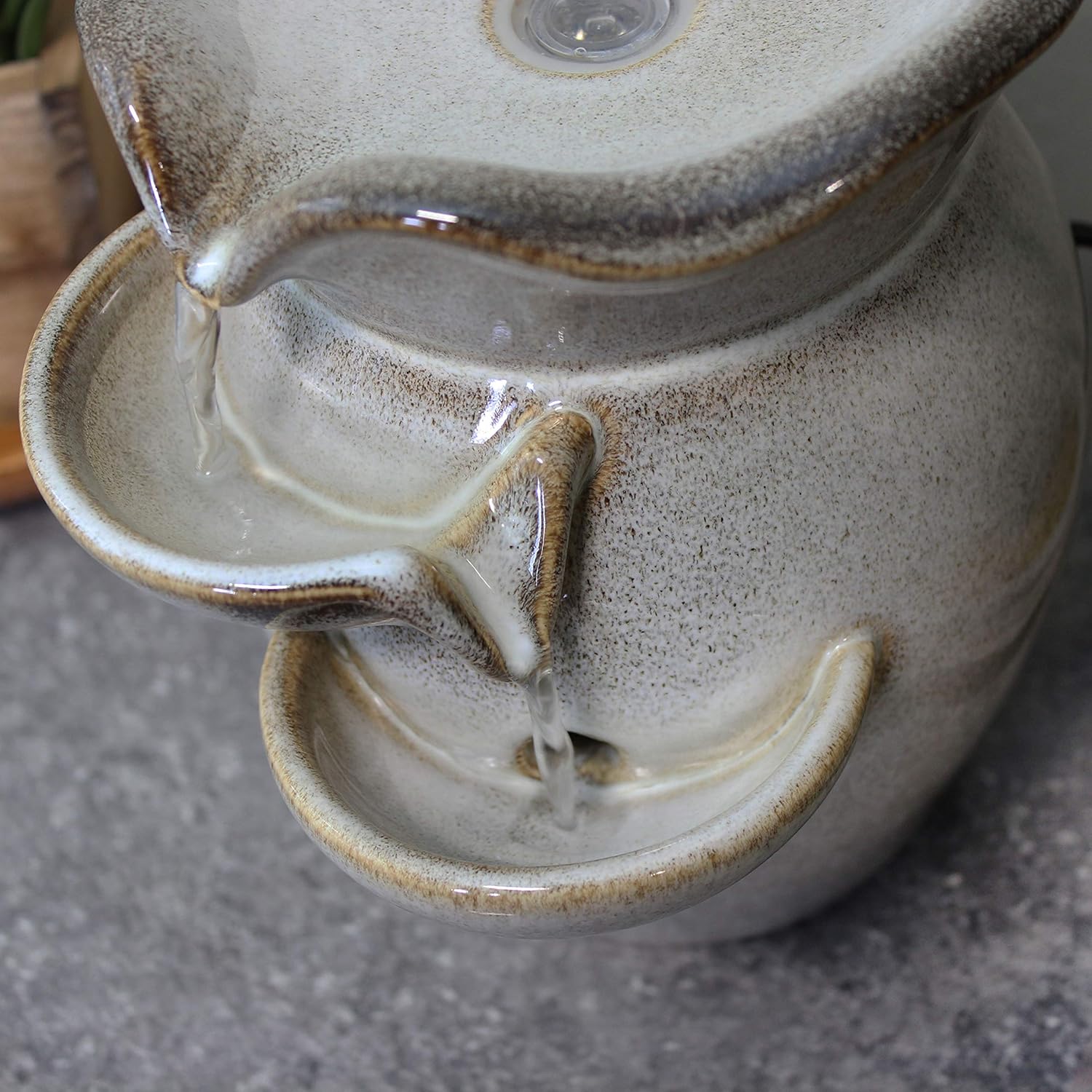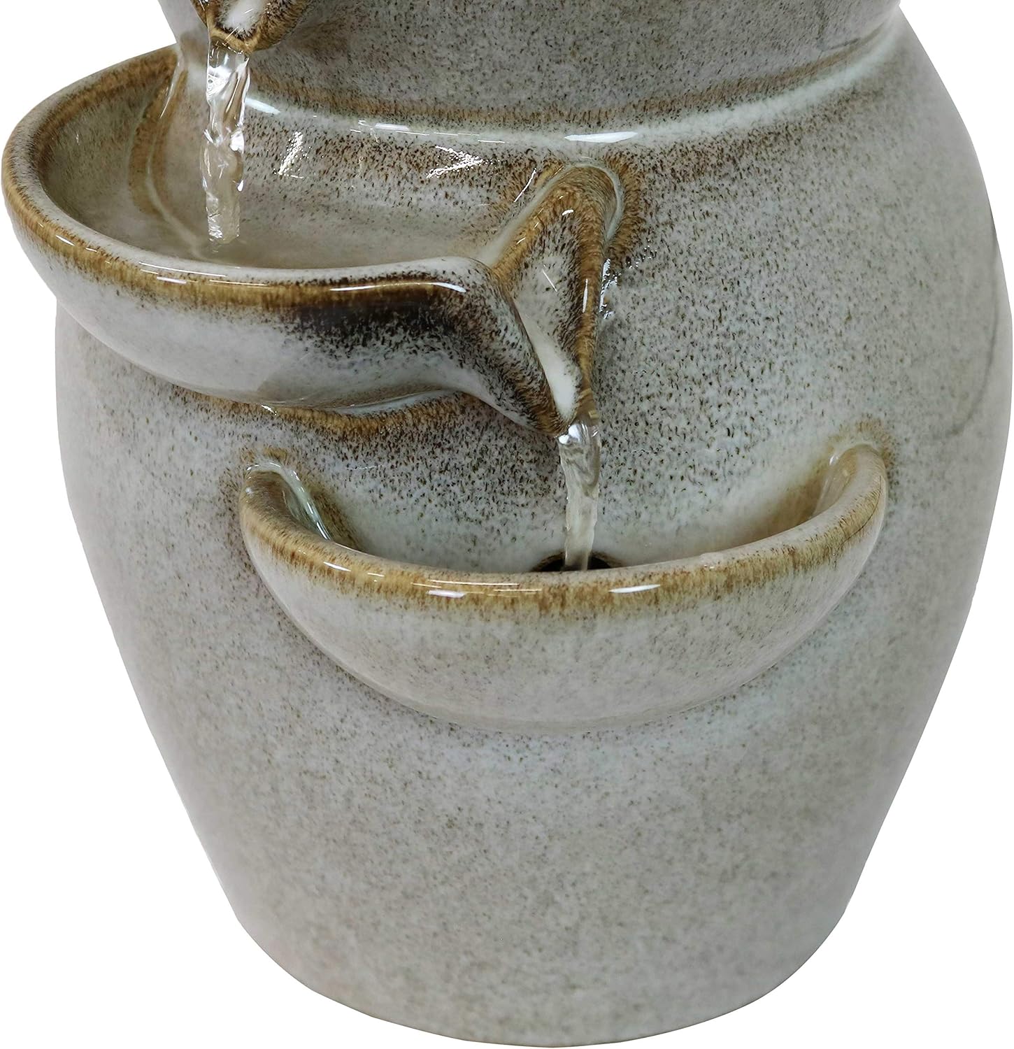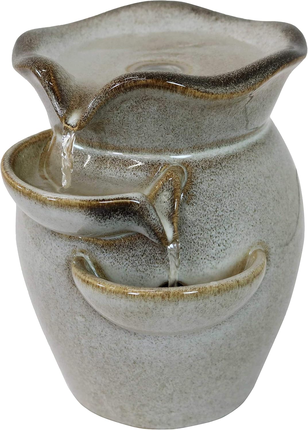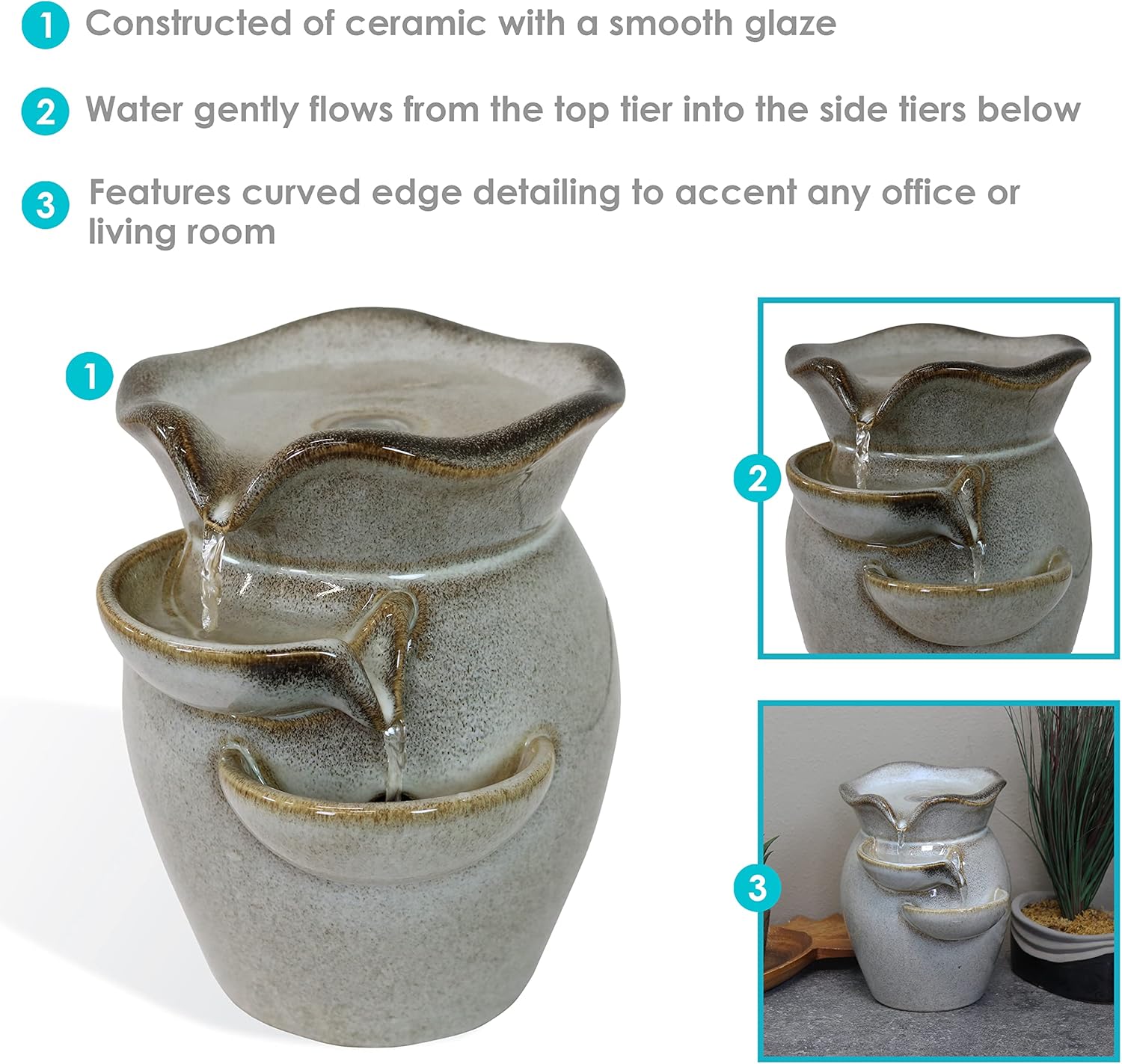 Make any home or office more tranquil and serene with the Cascading Side Tiers Ceramic Tabletop Water Fountain. Water flows gently from the top tier into the side tiers below, creating a calming ambiance. Perfect for decorating a desk, kitchen counter, or tabletop. Includes 1 tabletop fountain and 1 electric submersible pump for easy setup. No plumbing is required, as the pump recirculates water continuously.